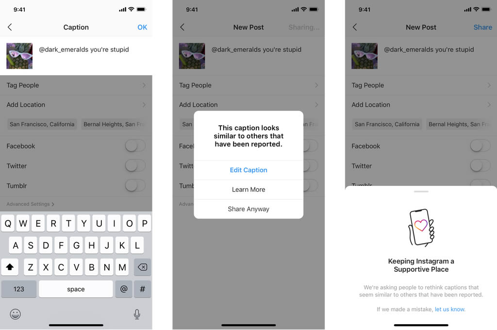นอกจากการตรวจสอบด้วยมนุษย์ Facebook ยังใช้ AI มาช่วยตรวจสอบเนื้อหาบน Instagram ด้วยเมื่อผู้ใช้งานเริ่มเขียนคำบรรยายภาพสำหรับโพสต์ลงฟีด AI จะตรวจสอบทันทีว่าข้อความเหล่านั้น มีแนวโน้มที่จะสร้างความเกลียดชังหรือไม่ และจะแจ้งให้ผู้ใช้งานทราบว่าข้อความของพวกเขาคล้ายกับ Bullying หรือการกลั่นแกล้ง เพื่อให้มีโอกาสได้แก้ไขข้อความก่อนโพสต์