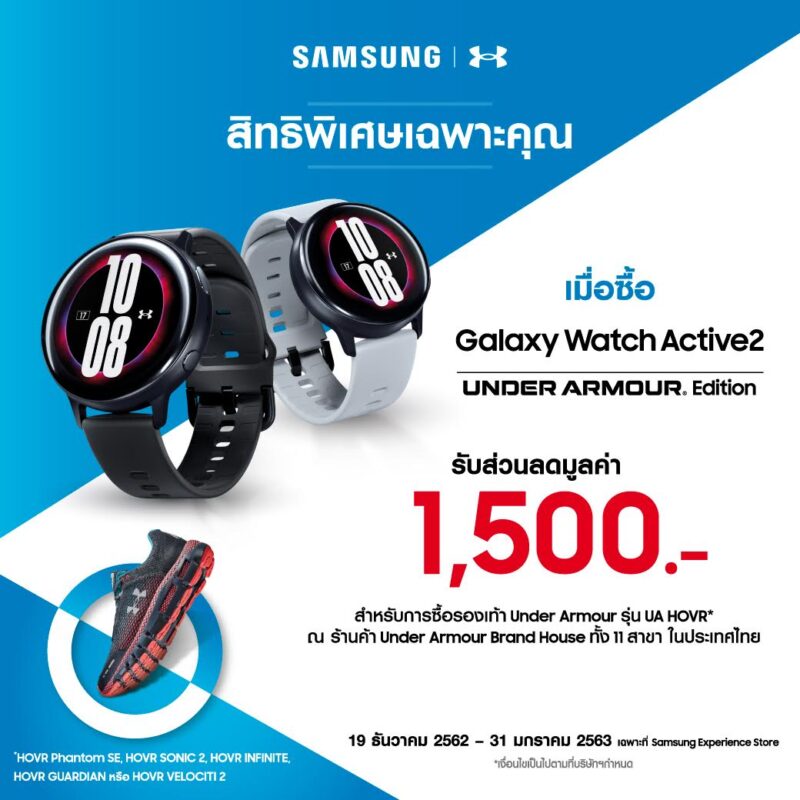 ซัมซุง ร่วมกับ อันเดอร์ อาร์เมอร์ ส่งโปรโมชั่นสุดพิเศษเอาใจนักวิ่งและสายออกกำลังกาย เมื่อซื้อ Galaxy Watch Active2 Under Armour Edition ที่ ซัมซุง เอ๊กซ์พีเรียนซ์ สโตร์ ระหว่างวันที่ 19 ธันวาคม 2562 – 31 มกราคม 2563 รับส่วนลดมูลค่า 1,500 บาท สำหรับซื้อรองเท้า Under Armour HOVR Run Series (รุ่น HOVR PHANTOM SE, HOVR SONIC 2, HOVR INFINITE, HOVR GUARDIAN หรือ HOVR VELOCITI 2) ที่ อันเดอร์ อาร์เมอร์ แบรนด์เฮ้าส์ ทั้ง 11 สาขาในประเทศไทย เพียงแสดงใบเสร็จการซื้อตัวจริงเพื่อใช้สิทธิ์ภายในวันที่ 31 มกราคม 2563
