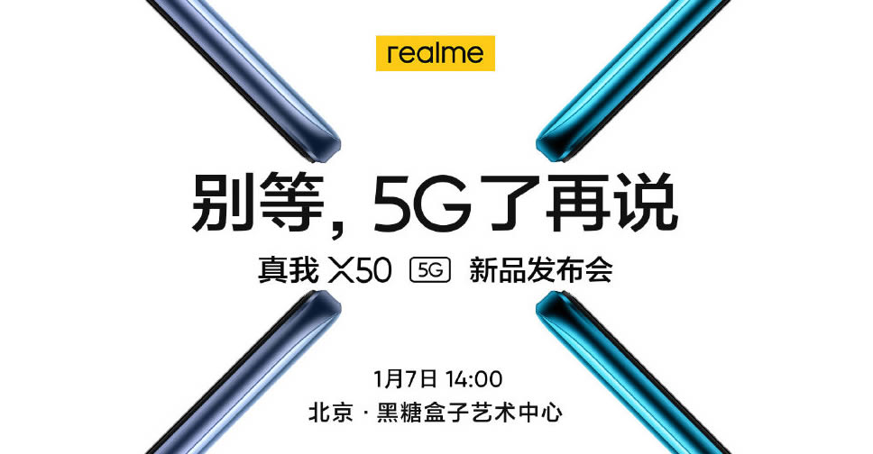 หลังจากเปิดเผยรายละเอียดออกมาบางส่วน สำหรับสมาร์ทโฟน realme X50 5G ล่าสุดได้รับการยืนยันแล้วว่าจะพร้อมเปิดตัวทางการ ในวันที่ 7 มกราคม 2020 และอาจมีรุ่น Lite Edition เปิดตัวพร้อมกันด้วย ส่วนงานเปิดตัวจะจัดขึ้นในกรุงปักกิ่ง ประเทศจีน