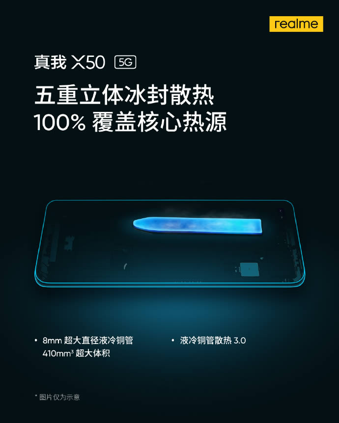 realme X50 5G ถูกเปิดเผยออกมาก่อนหน้านี้ว่า จะใช้ชิปประมวลผล Qualcomm Snapdragon 765G พร้อมระบบระบายความร้อนด้วยของเหลวจากท่อทองแดงขนาดใหญ่พิเศษ 8 มิลลิเมตร และตำแหน่งการจัดวางจะครอบคลุมพื้นที่ปล่อยความร้อน 100% รองรับการเชื่อมต่อ 5G และ Wi-Fi ได้พร้อมกัน นอกจากนี้การเชื่อมต่อ Wi-Fi ก็ยังสามารถเชื่อมต่อกับ 2.4GHz และ 5GHz ได้พร้อมกันด้วย