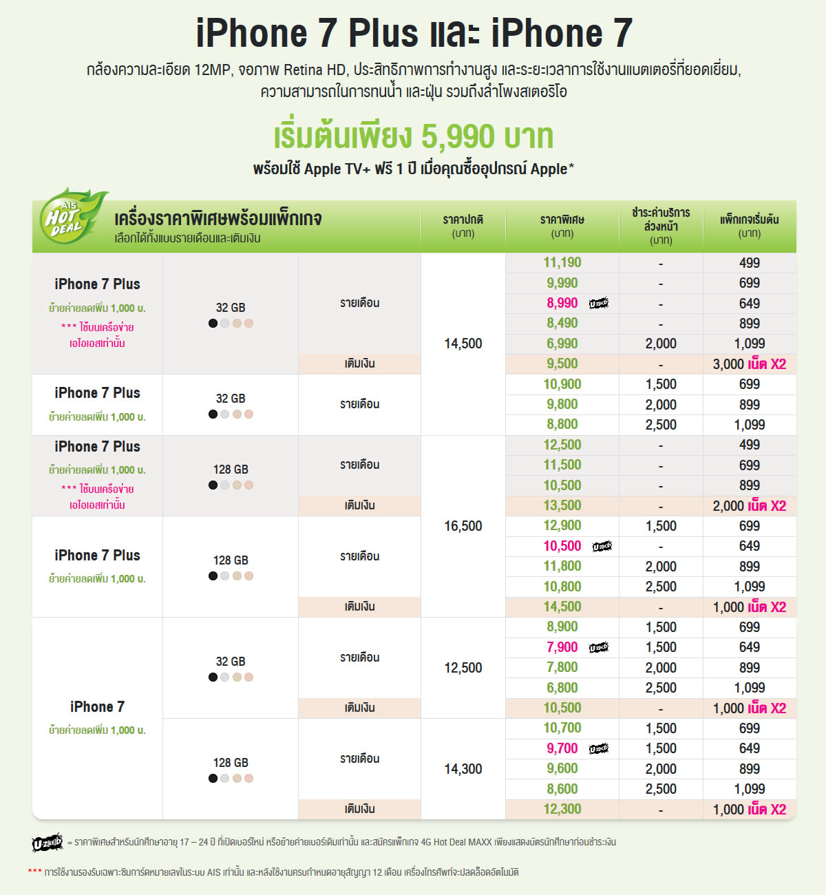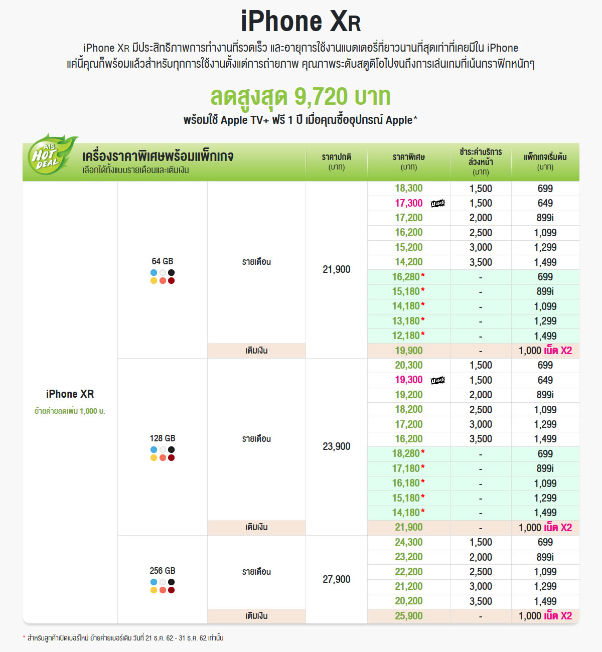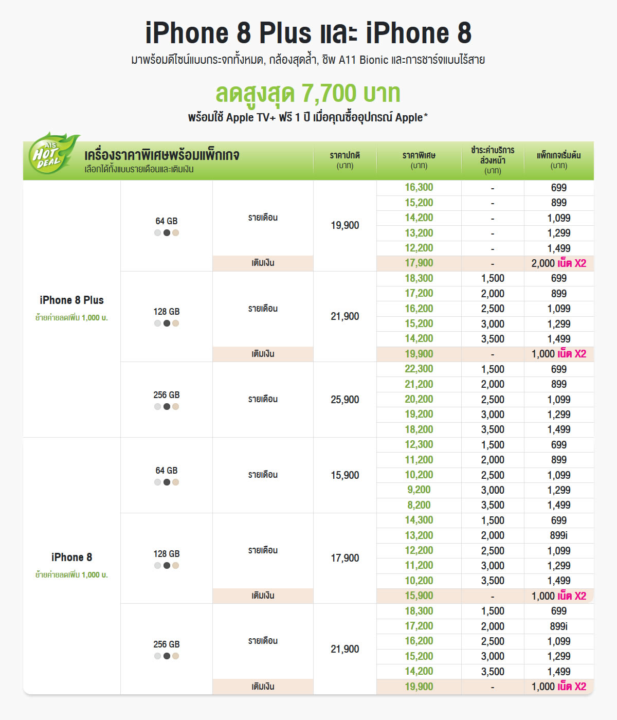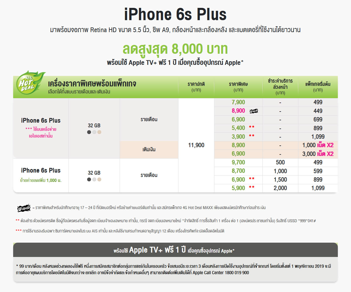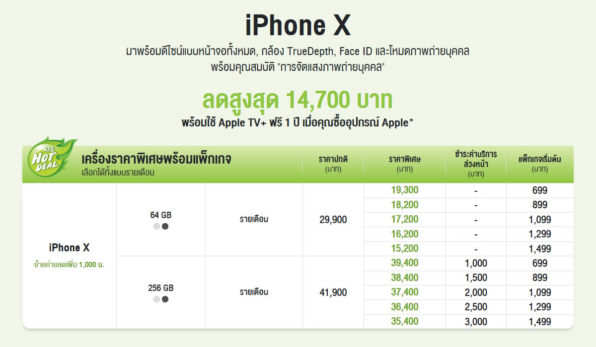 AIS มอบความสุขส่งท้ายปีด้วยส่วนลดพิเศษสำหรับ iPhone ทุกรุ่น iPhone Xs Max และ iPhone Xs ลดสูงสุด 17,020 บาท iPhone XR ลดสูงสุด 9,720 บาท iPhone X ลดสูงสุด 14,700 บาท iPhone 8 Plus และ iPhone 8 ลดสูงสุด 7,700 บาท iPhone 7 Plus และ iPhone 7 เริ่มต้นเพียง 5,990 บาท