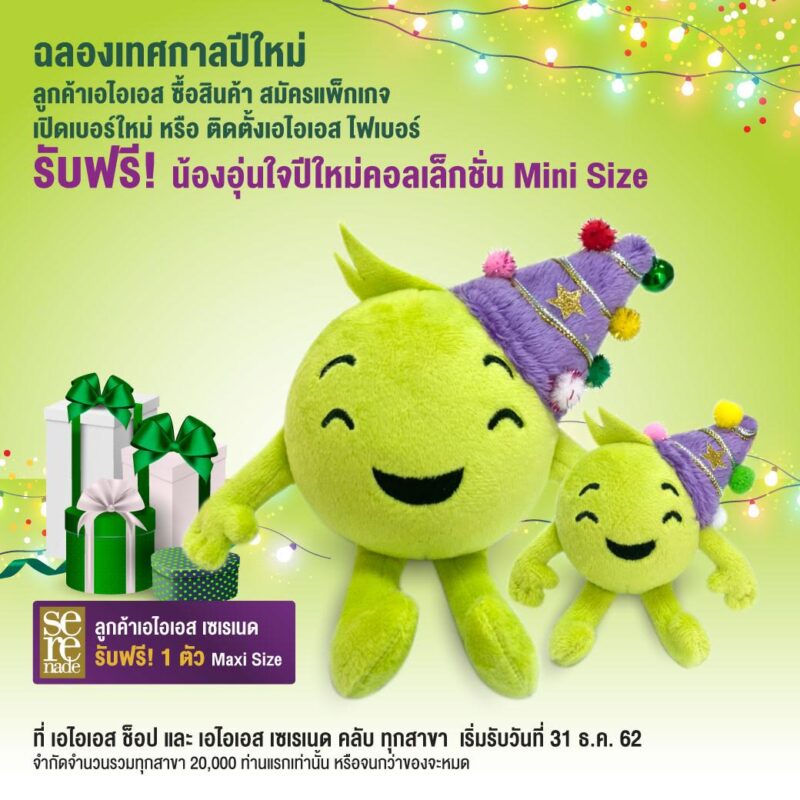 4.      จัดเต็มของขวัญชิ้นพิเศษ สะสมให้ครบทั้ง 2 แบบ กับน้องอุ่นใจคอลเล็กชั่นพิเศษ ต้อนรับเทศกาลคริสต์มาส และปีใหม่ สำหรับลูกค้าเอไอเอส และเซเรเนด เมื่อซื้อสินค้า สมัครแพ็กเกจ เปิดเบอร์ใหม่ หรือติดตั้งเอไอเอส ไฟเบอร์ รับฟรี!! น้องอุ่นใจคริสต์มาสสุดคิ้วท์ รับได้ในวันที่ 25 ธันวาคม 2562 (จำนวนจำกัด) และน้องอุ่นใจปีใหม่แสนน่ารัก รับได้ในวันที่ 31 ธันวาคม 2562 (จำนวนจำกัด) ที่ AIS Shop และ Serenade Club ทุกสาขาทั่วประเทศ (1 หมายเลข / 1 สิทธิ์ / 1 ชิ้น)