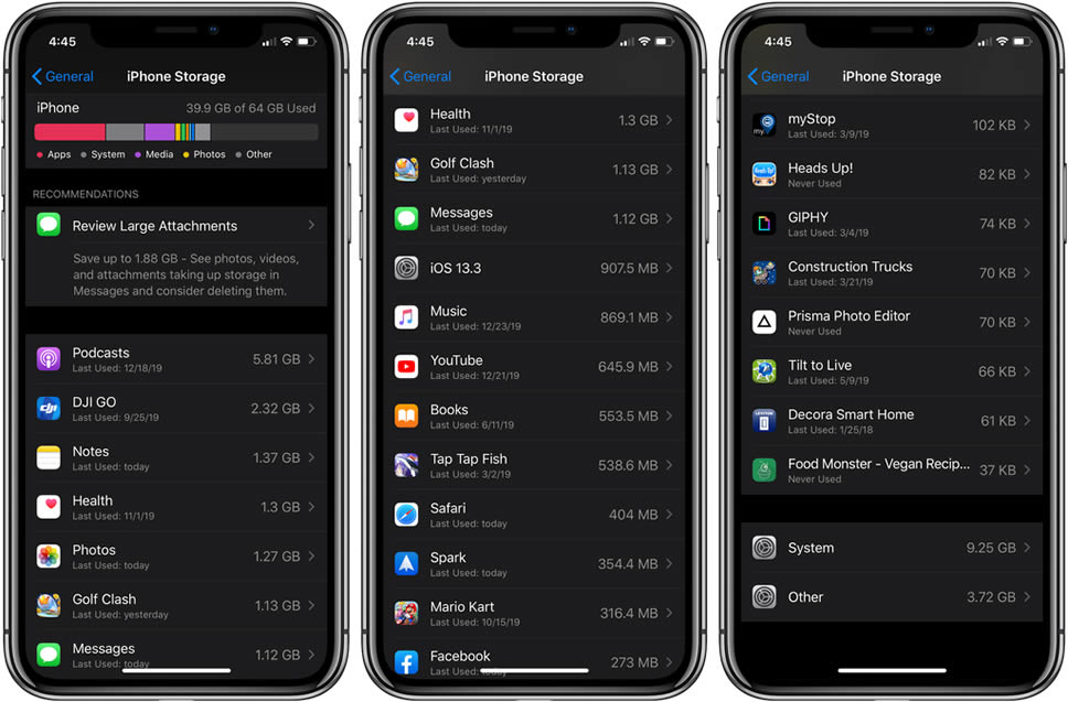 เข้าไปที่ Settings > General > iPhone Storage แล้วจะพบกับฟีเจอร์ Review Large Attachments เพื่อตรวจสอบไฟล์ต่างๆ ที่แนบมา และอาจไม่จำเป็นต้องใช้แล้ว อีกทั้งยังมีฟีเจอร์ Offload Unused Apps สำหรับลบแอพที่ไม่ได้ใช้งานออกไป