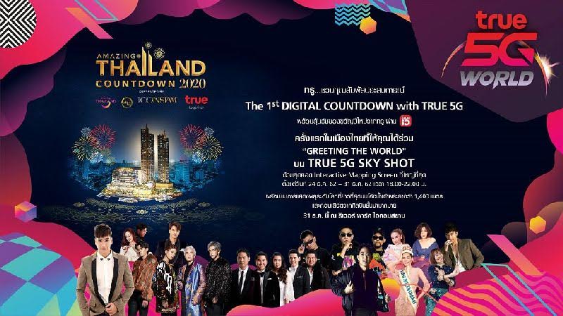 ที่สุดแห่งประสบการณ์เคาท์ดาวน์ระดับโลกแห่งเดียวของประเทศไทย ซึ่งทุกคนสามารถมีส่วนร่วมนับถอยหลังก้าวสู่ปีใหม่แบบดิจิทัลสุดล้ำกับทรู 5G เครือข่ายที่ดีที่สุด ที่กำลังจะเกิดขึ้นเพื่อคนไทย ในงาน Amazing Thailand Count Down 2020 ณ ไอคอนสยาม แลนด์มาร์กใหม่ของโลกริมเจ้าพระยา โดยนำนวัตกรรมจออินเตอร์แอ็กทีฟ TRUE 5G Sky Shot ครั้งแรกในเมืองไทยที่ให้คุณร่วม “Greeting the World” กับสุดยอด Interactive Mapping Screen ใหญ่ที่สุดกว่า 4,000 ตารางเมตร ที่ใช้เทคนิคการยิงภาพความคมชัดสูงไปยังอาคารฝั่งตรงข้าม ให้เกิดแสงสียิ่งใหญ่ โดดเด่นตระการตาในคุ้งน้ำเจ้าพระยาหน้าไอคอนสยาม โดยทรู พร้อมนำความเป็น World Class Digital Lifestyle Brand ร่วมสร้างสีสันแบบเอ็กซ์คลูซีฟ โดยจัดบูธกิจกรรมที่เปิดโอกาสให้ผู้ร่วมงานได้ถ่ายภาพ แล้วโพสต์แบ่งปันประสบการณ์และความสนุกกับผู้คนทั่วไปขึ้นไปบนจอ TRUE 5G Sky Shot แบบเรียลไทม์ ตั้งแต่ 24 – 31 ธันวาคมนี้ และพิเศษ 31 ธันวาคม ร่วมต้อนรับปีใหม่ “The 1st Digital Countdown with TRUE 5G” แห่งยุคดิจิทัลไปด้วยกันอย่างสุดประทับใจ โดยจะขึ้นตัวเลขให้ทุกคนร่วมนับถอยหลังบน TRUE 5G Sky Shot  อีกหนึ่งไฮไลท์ภายในงานก่อนการแสดงพลุระดับโลก ชุด 7 Wonders of Blessing สุดตระการตา ที่ยาวที่สุดบนโค้งน้ำเจ้าพระยากว่า 1,400 เมตร จะถูกถ่ายทอดไปทั่วโลก