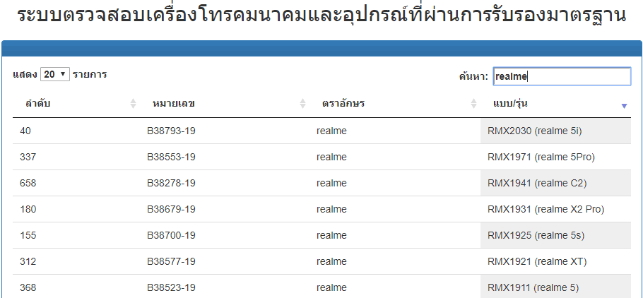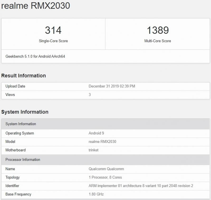 realme 5i ที่ผ่านการรับรองจาก กสทช. ใช้รหัสรุ่น RMX2030 ซึ่งเป็นรหัสเดียวกับที่พบในฐานข้อมูลของแอพพลิเคชั่น Geekbench
