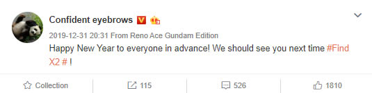Brian Shen รองประธานและประธานฝ่ายการตลาดทั่วโลกของ OPPO ได้กล่าวสวัสดีปีใหม่ ผ่านทาง Weibo แพลตฟอร์มโซเชี่ยลยอดนิยมในประเทศจีน พร้อมยืนยันว่าเรือธงรุ่นถัดไปที่กำลังจะได้รับการเปิดตัวในเร็วๆ นี้ คือ OPPO Find X2