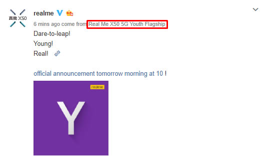 realme กำลังจะเปิดตัวสมาร์ทโฟนระดับเรือธง realme X50 5G ในวันที่ 7 มกราคม 2020 แต่ล่าสุดบัญชีทางการของ realme ใน Weibo ยืนยันว่าจะเปิดตัวรุ่นน้องออกมาก่อนในวันที่ 3 มกราคมนี้