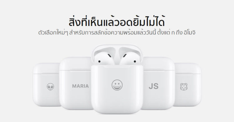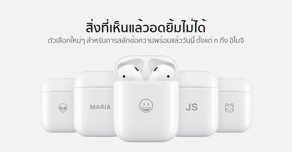 บริการสลักข้อความและรูปภาพอีโมจิ ให้บริการฟรี!! ไม่ว่าจะสั่งซื้อ AirPods หรือ AirPods Pro เพียงเข้าไปเลือกซื้อ AirPods บนเว็บไซต์ของ Apple แล้วคลิกที่ “ใส่ความเป็นคุณฟรี” จากนั้นเลือกอีโมจิที่ต้องการ ซึ่งมีให้เลือกมากกว่า 30 แบบ หรือเลือกสลักเป็นข้อความที่ต้องการ