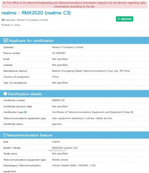 หลังจาก realme 5i (RMX2030) ผ่านการรับรองมาตรฐานของ กสทช. เรียบร้อยแล้ว ตามที่เรานำเสนอไปก่อนหน้านี้ ล่าสุดก็มีรายงานว่า realme C3 (RMX2020) ก็ผ่านการรับรองจาก กสทช. เช่นเดียวกัน จึงมีความเป็นไปได้ที่ realme จะเปิดตัวสมาร์ทโฟนทั้ง 2 รุ่น พร้อมกันในอนาคตอันใกล้นี้