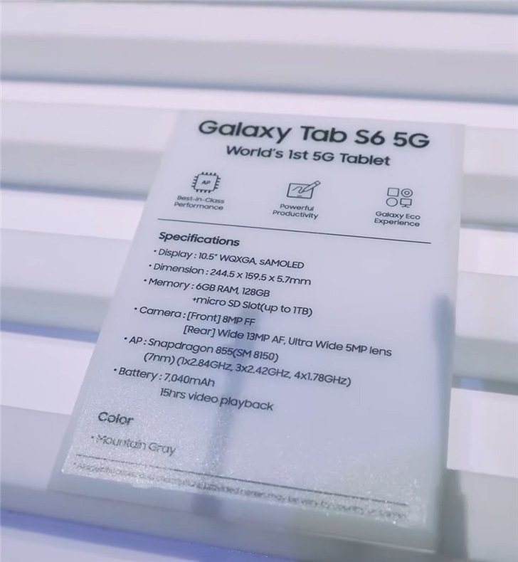 Samsung วางแผนเปิดตัว Galaxy Tab S6 5G แท็บเล็ต 5G รุ่นแรกของโลกในต้นปีนี้ และดูเหมือนยังใช้ดีไซน์เดียวกับ Galaxy Tab S6 ที่วางจำหน่ายในเดือนสิงหาคม 2019 อ้างอิงจากภาพหลุดที่นำเสนอโดยเว็บไซต์ในประเทศจีน