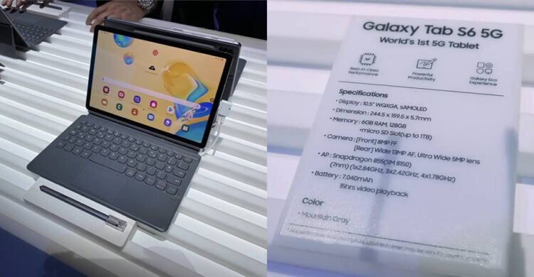 ทั้งนี้ Samsung Galaxy Tab S6 5G มาพร้อมจอแสดงผล Super AMOLED (1600 x 2560 พิกเซล) ขนาด 10.5 นิ้ว ใช้ชิปประมวลผล Qualcomm Snapdragon 855 ความจำ RAM 6GB จับคู่กับ ROM 128GB รองรับการ์ด microSD สูงสุด 1TB กล้องหน้า 8 ล้านพิกเซล กล้องหลัง 13 + 5 ล้านพิกเซล ความจุแบตเตอรี่ 7040mAh เล่นวีดีโอนานสูงสุด 15 ชั่วโมง และมีขนาดบอดี้ 244.5 x 159.5 x 5.7 มิลลิเมตร