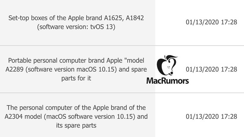 นอกจากนี้ Apple ยังจดทะเบียน Mac Pro ที่ใช้รหัส A2304 และ Apple TV ภายใต้รหัส A1625 และ A1842