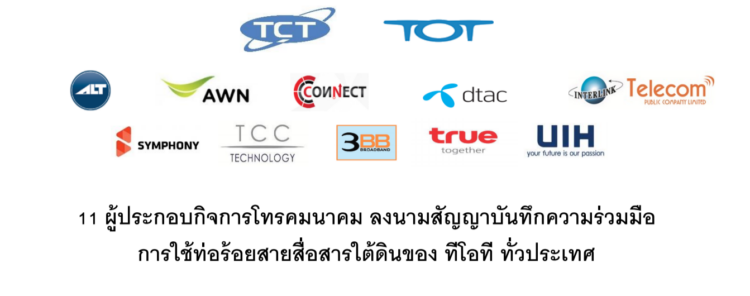 ผู้ประกอบการกิจการโทรคมนาคม 11 ราย ซึ่งเป็นสมาชิกสมาคมโทรคมนาคม แห่งประเทศไทยในพระบรมราชูปถัมภ์ ประกอบไปด้วย บริษัท เอแอลที เทเลคอม จำกัด (มหาชน), บริษัท แอดวานซ์ ไวร์เลส เน็ทเวอร์ค จำกัด, บริษัท เคเบิลคอนเนค จำกัด, บริษัท ดีแทค ไตรเน็ต จำกัด, บริษัท อินเตอร์ลิ้งค์ เทเลคอม จำกัด (มหาชน), บริษัท ซิมโฟนี่ คอมมูนิเคชั่น จำกัด (มหาชน), บริษัท ที.ซี.ซี. เทคโนโลยี จำกัด, บริษัท ทริปเปิลที บรอดแบนด์ จำกัด (มหาชน), บริษัท ทรู อินเทอร์เน็ต คอร์ปอเรชั่น จำกัด , บริษัท ทรู มูฟ เอช ยูนิเวอร์แซล คอมมิวนิเคชั่น จำกัด และ บริษัท ยูไนเต็ด อินฟอร์เมชั่น ไฮเวย์ จำกัด ได้ทำพิธีลงนามสัญญาบันทึกความร่วมมือการใช้ท่อร้อยสารสื่อสารใต้ดินของ บริษัท ทีโอที จำกัด (มหาชน)