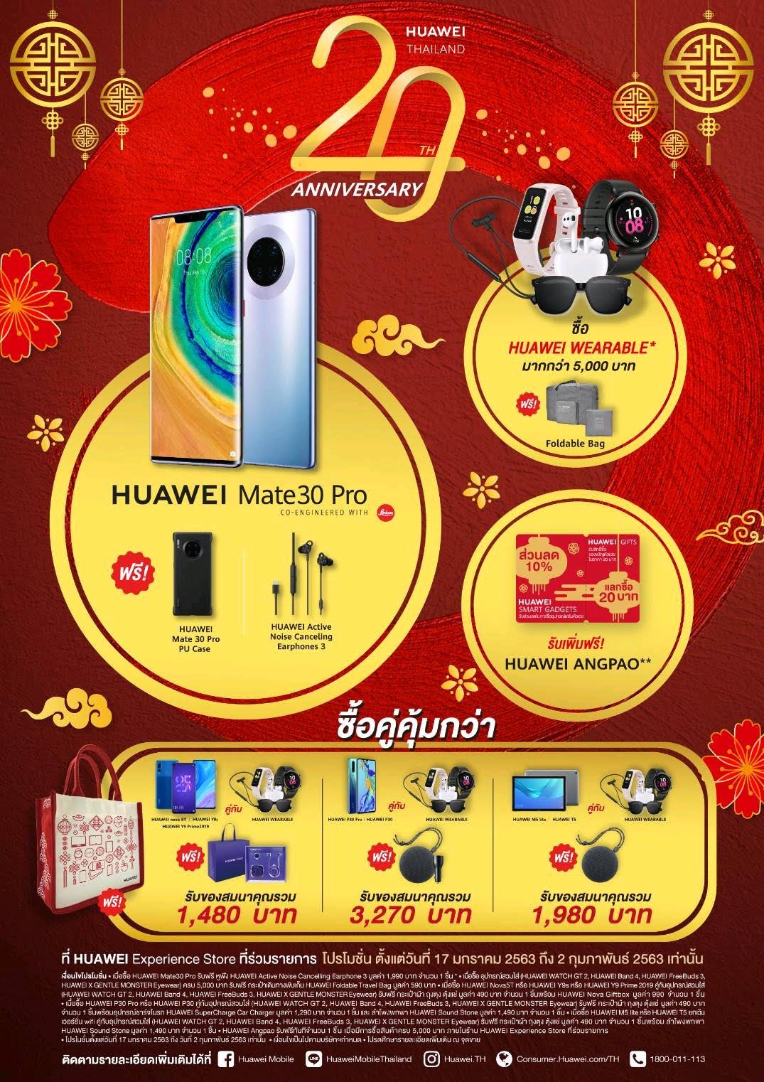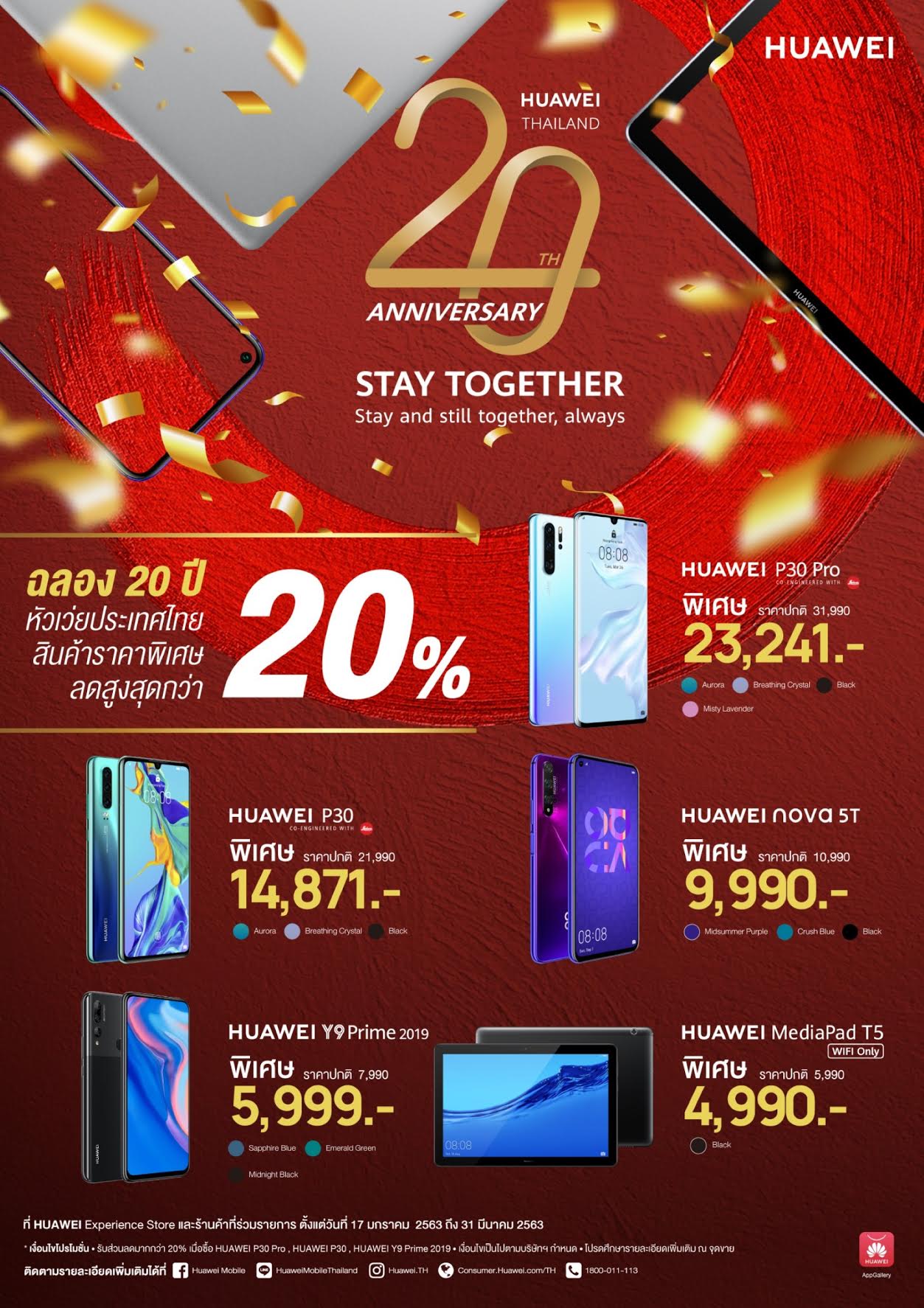 หัวเว่ย ประเทศไทย ฉลองครบรอบ 20 ปี จัดโปรโมชั่นแคมเปญ “Huawei Thailand 20th Anniversary” ลด! แลก! แจก! แถม! แบบจัดเต็ม ขนทัพสมาร์ทโฟนและแท็บเล็ตจัดราคาพิเศษ ลดสูงสุดถึง 75% พร้อมมอบสิทธิพิเศษ ของขวัญสุดพรีเมียม และแจกอั่งเปาเรียกความเฮงรับตรุษจีน เพื่อแทนคำขอบคุณลูกค้าที่ให้การตอบรับอย่างดีตลอดระยะเวลาที่ผ่านมา