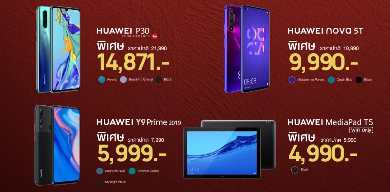- HUAWEI P30 Series สมาร์ทโฟนเรือธงซีรีย์ยอดฮิตที่มาสร้างสร้างบรรทัดฐานใหม่ของการถ่ายภาพ ได้แก่ HUAWEI P30 Pro ในราคาสุดพิเศษเพียง 23,241 บาท จากราคาปกติ 31,990 บาท และ HUAWEI P30 เพียง 14,871 บาท จากปกติ 21,990 บาท