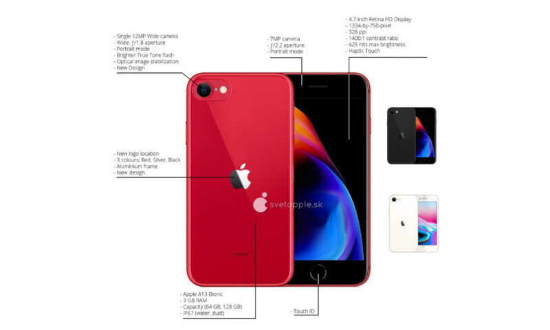 iPhone ราคาประหยัด ถูกลือมาอย่างยาวนานในฐานะ iPhone SE รุ่นที่ 2 ก่อนจะมีความชัดเจนมากขึ้นเรื่อยๆ ในฐานะทายาทของ iPhone 8 โดยใช้จอแสดงผล LCD ขนาด 4.7 นิ้ว ติดตั้งปุ่มโฮมไว้ใต้จอแสดงผล พร้อม Touch ID กล้องหลังตัวเดียว ได้รับชิป A13 เช่นเดียวกับ iPhone รุ่นพรีเมี่ยมในปี 2019 และมาพร้อม RAM 3GB
