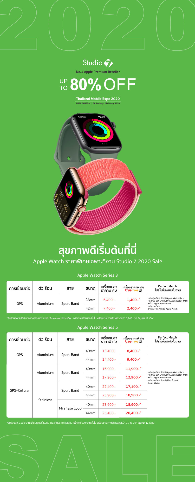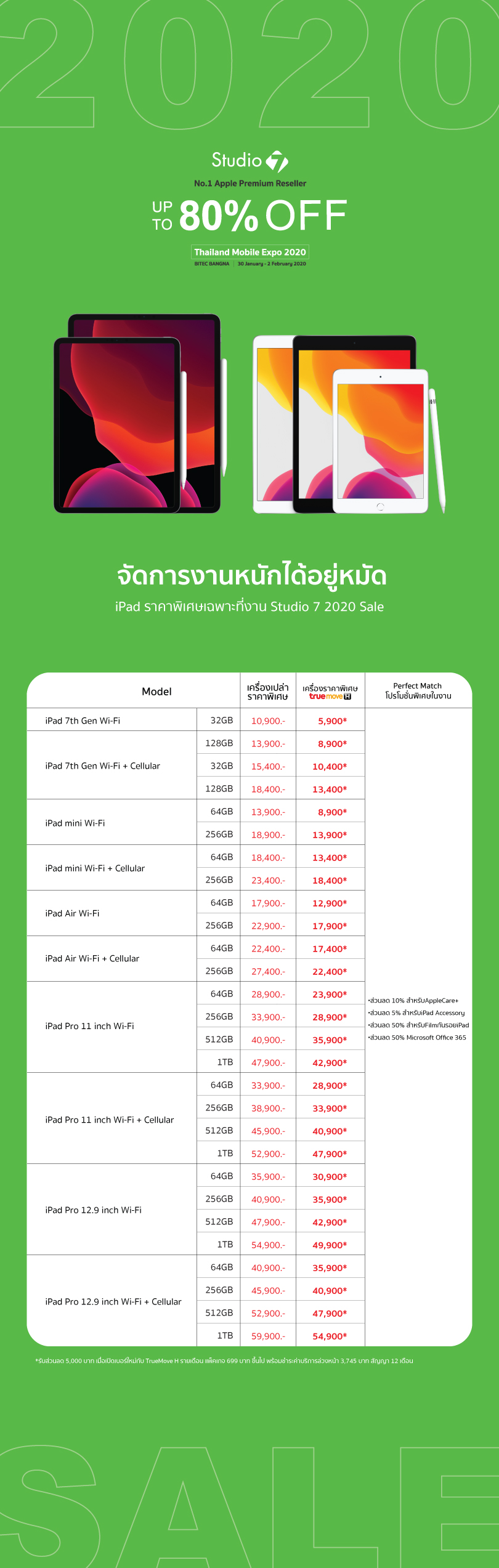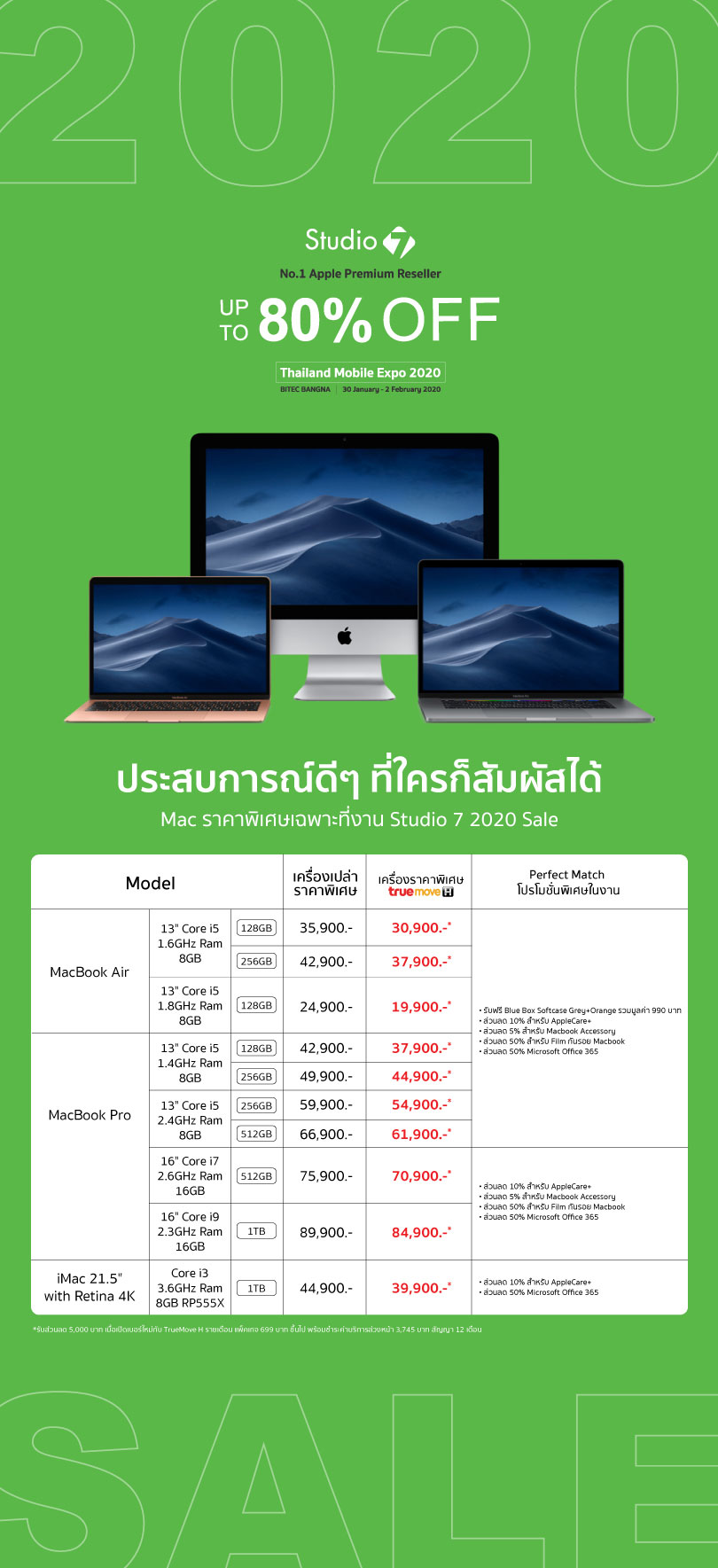มหกรรมมือถือที่ใหญ่ที่สุดของประเทศไทยกลับมาแล้วกับงาน Thailand Mobile Expo 2020 กับบูธ Studio 7 ที่มาพร้อมโปรโมชั่นสุดแรง ลดสูงสุด 80%* และยังให้คุณผ่อนสบาย 0% นานสูงสุด 24 เดือน* อาทิ iPhone, iPad, Mac, Apple Watch, Gadget และ Accessories ที่ขนมาลดต้อนรับปี 2020 ในราคาพิเศษเฉพาะงานนี้เท่านั้น