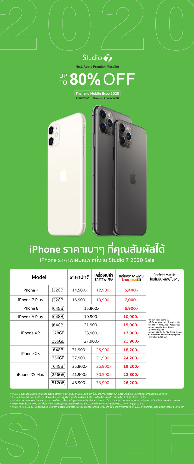 iPhone ราคาพิเศษเฉพาะที่งาน Studio 7 2020 Sale @TME2020 BITEC BANGNA ให้คุณผ่อนสบาย 0% นานสูงสุด 24 เดือน* และพร้อมรับสิทธิ์โปรโมชันสุดคุ้มอีกมากมาย