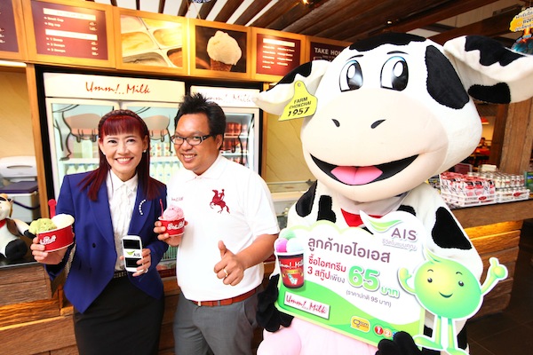 เอไอเอส โดย คุณวิลาสินี พุทธิการันต์ รองกรรมการผู้อำนวยการ สายงานบริการลูกค้าและการบริการ ร่วมกับคุณภูวนาถ บางพาน รองประธาน สาขางานธุรกิจค้าปลีก และคุณรัชนิกร พันธ์ภักดี ผู้ช่วยผู้จัดการฝ่ายร้านค้าปลีก กลุ่มบริษัทฟาร์มโชคชัย ร่วมส่งแคมเปญสุดร้อนแรงรับหน้าฝน เอาใจลูกค้าเอไอเอสที่รักสุขภาพ เสิร์ฟรสชาติความอร่อยของไอศกรีมอืมม์!มิลล์ ซึ่งผลิตจากนมสดแท้คุณภาพดี จากฟาร์มโชคชัยให้ลูกค้าเอไอเอสได้อร่อย ฟรีทันที 1 สกู๊ป (จำกัด 500 ท่าน/วัน) ตั้งแต่วันนี้ – 30 มิถุนายนนี้