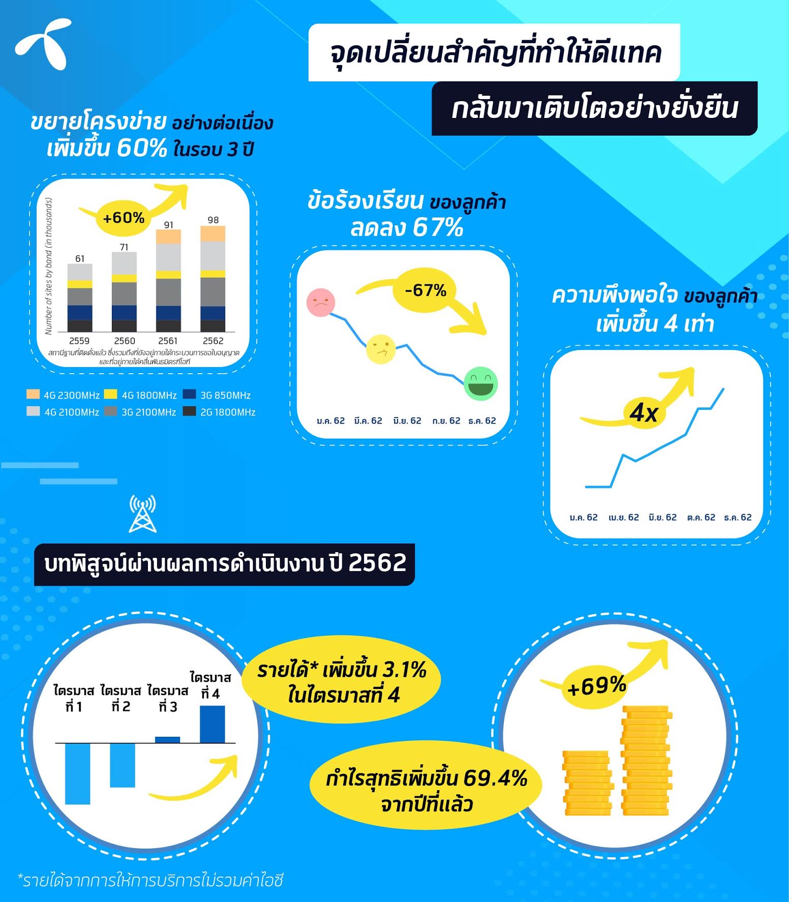 ทั้งนี้ ณ สิ้นปี 2562 ดีแทคมีฐานลูกค้าจำนวนทั้งสิ้น 20.6 ล้านราย ลดลง 560,000 ราย มีรายได้จากการให้บริการ (ไม่รวมค่าไอซี) ในไตรมาส 4/62 เติบโตร้อยละ 3.1 เมื่อเทียบกับช่วงเดียวกันของปีก่อน ขณะที่รายได้จากค่าบริการหลักในปี 2562 เติบโตร้อยละ 0.1 เมื่อเทียบกับปีก่อน โดยเป็นผลมาจากพัฒนาการจำนวนลูกค้าที่ดีขึ้นในระบบเติมเงิน โดยมีจำนวนลูกค้าเพิ่มขึ้นในไตรมาส 4/62 ขณะที่จำนวนลูกค้าในระบบรายเดือนมีการเติบโตอย่างต่อเนื่อง ทั้งนี้ กำไรสุทธิสำหรับปี 2562 มีมูลค่าทั้งสิ้น 5.9 พันล้านบาท เติบโตร้อยละ 69.4 เมื่อเทียบกับปีก่อน ซึ่งเป็นผลมาจากการลดลงของต้นทุนค่าธรรมเนียมและค่าตัดจำหน่ายสินทรัพย์ภายใต้สัมปทานที่สิ้นสุดลงแล้ว
