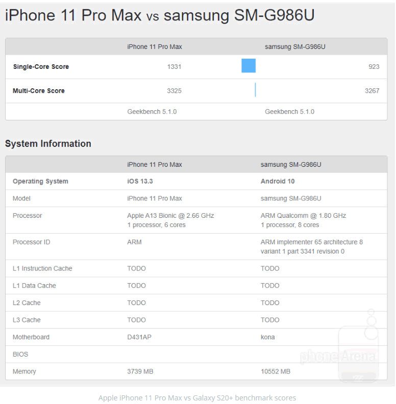 ในกรณีที่อยากเห็นว่าประสิทธิภาพระหว่าง Galaxy S20 vs iPhone 11 series จะแตกต่างกันขนาดไหน Phonearena ได้พบข้อมูล Galaxy S20+ ที่ใช้รหัสรุ่น SM-G986U มาเปรียบเทียบกับ iPhone 11 Pro Max โดยอ้างอิงข้อมูลจากแอพพลิเคชั่น Geekbench และดูเหมือนคะแนนระหว่าง 2 รุ่น จะแตกต่างกันชัดเจน