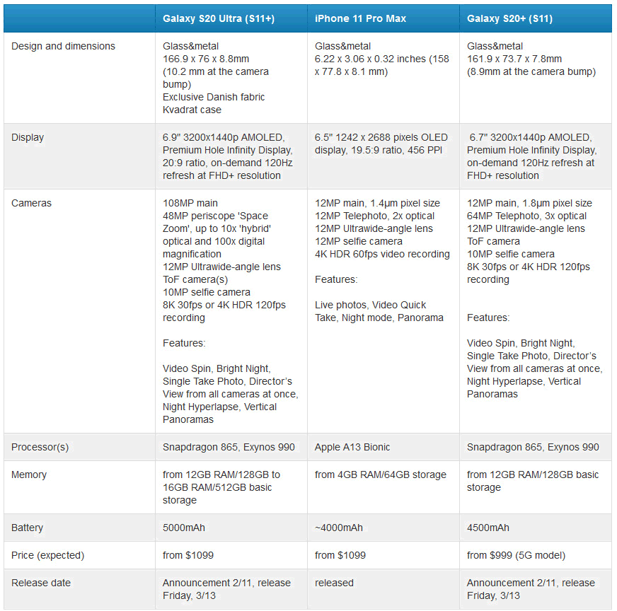 Samsung ยังไม่ได้เปิดตัวสมาร์ทโฟน Galaxy S20 series อย่างทางการ จนกว่าจะถึงวันที่ 11 กุมภาพันธ์นี้ และเลี่ยงไม่ได้ที่จะถูกนำไปเปรียบเทียบกับคู่แข่งอย่าง iPhone 11 series แต่ก่อนที่จะมีของจริงออกมาให้สัมผัส Phonearena ก็ได้นำ 2 เรือธงมาเปรียบเทียบให้ดูแล้ว ทั้งความแตกต่างของขนาด สเปก และ ราคา โดยอ้างอิงข้อมูล Galaxy S20 series มาจากข่าวลือที่รั่วไหลออกมาก่อนหน้านี้