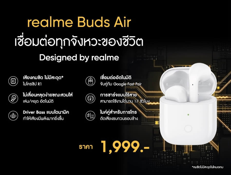 realme Buds Air ตัวจริงการเชื่อมต่อแบบไร้สาย ตอบโจทย์สำหรับใครที่กำลังมองหาหูฟังไร้สายที่อัดแน่นไปด้วยคุณภาพห้ามพลาด ในราคาเพียง 1,999 บาท