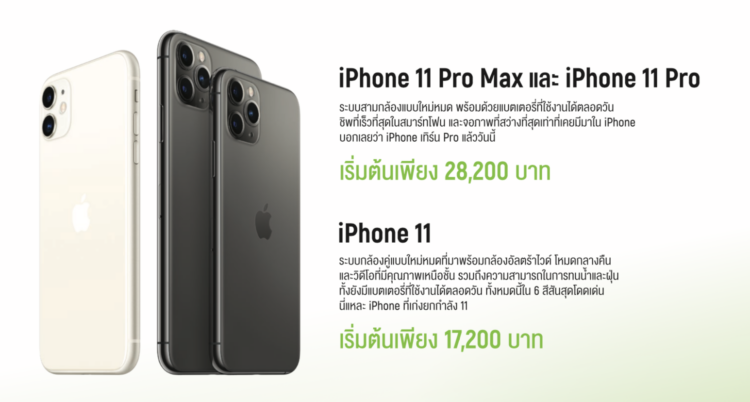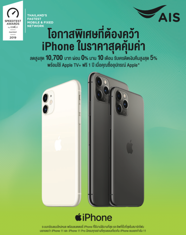 เริ่มจากโปรโมชั่นของ iPhone 11 ซึ่งเรียกได้ว่าเป็น iPhone ซึ่งเรียกได้ว่าเป็น iPhone รุ่นล่าสุดนั้น ทาง AIS ได้จัดโปรโมชั่นเครื่องเปล่าราคาพิเศษ ไม่ต้องชำระค่าบริการล่วงหน้า เมื่อสมึครตามแพ็กเกจที่กำหนด โดยมีราคาเริ่มต้นที่ 17,200 บาท จากราคาปกติ 24,900 บาท สำหรับ iPhone 11 รุ่น 64 GB โดยจะต้องซื้อพร้อมสมัครแพ็กเกจ 1,499 บาท