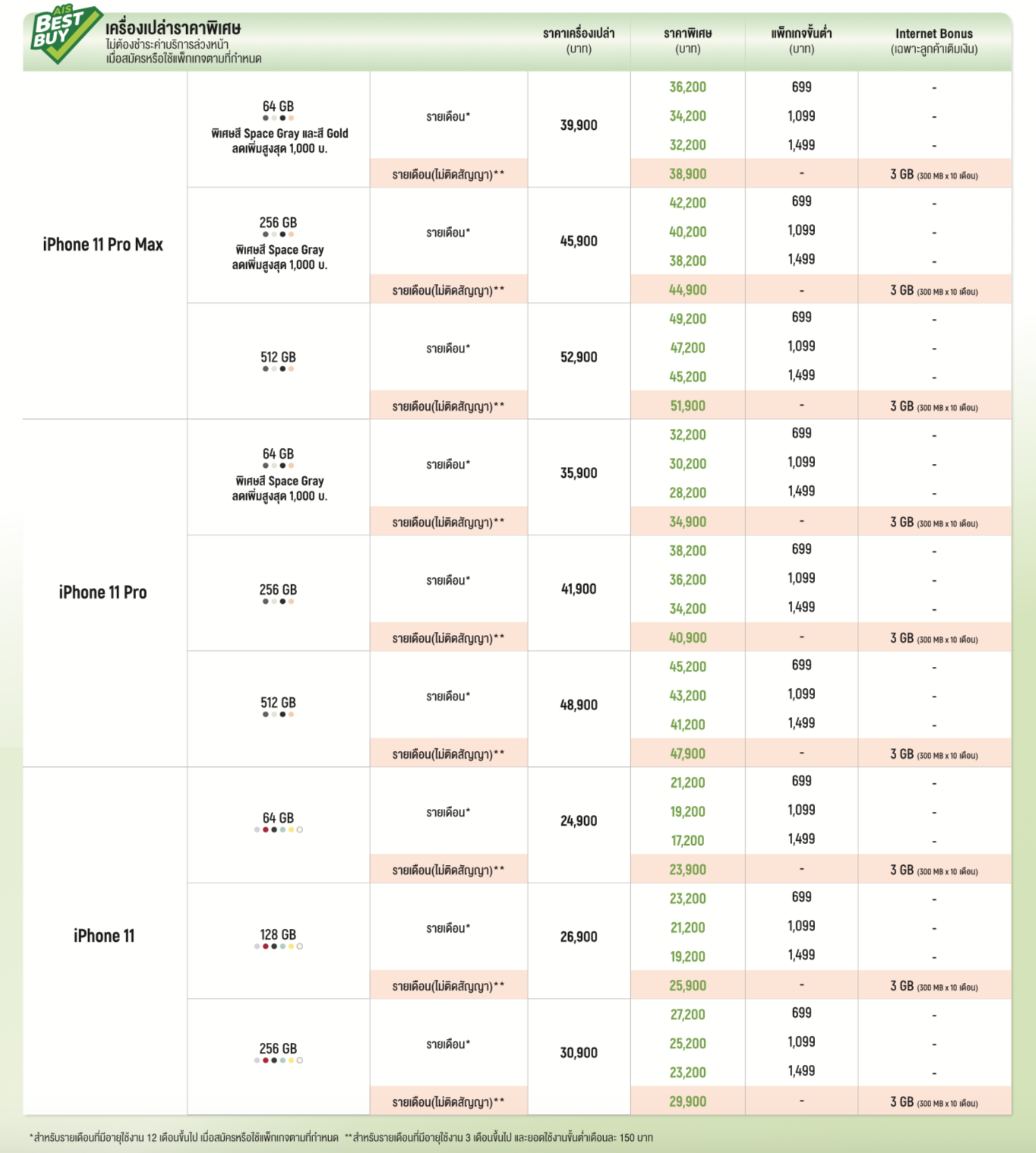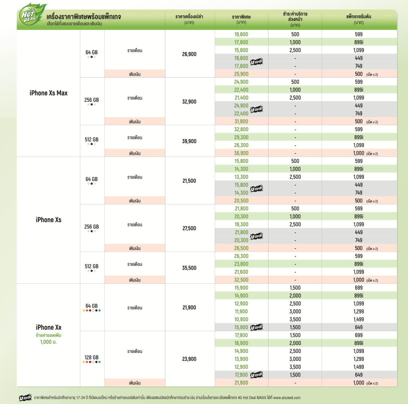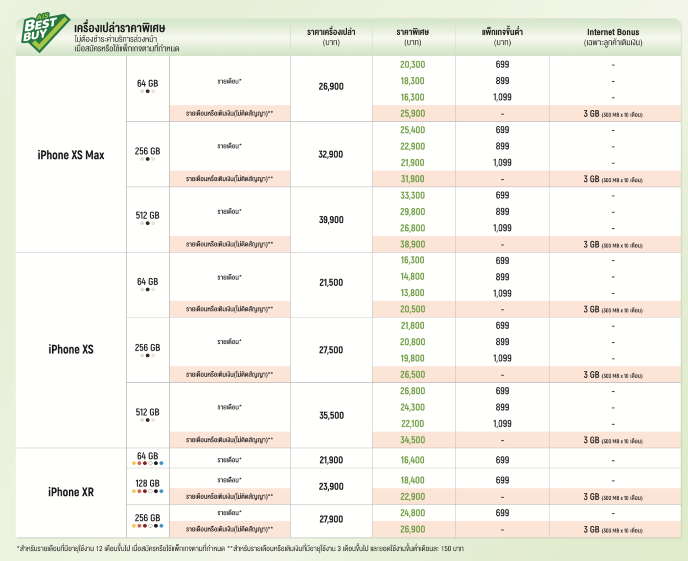 โปรโมชั่นเครื่องเปล่าราคาพิเศษพร้อมพิเศษของ iPhone XR รุ่น 64 GB นั้น มีราคาเริ่มต้นที่ 10,900 บาท จากราคาปกติ 21,900 บาท โดยจะต้องซื้อพร้อมสมัครแพ็กเกจ 1,499 บาท พร้อมชำระค่าบริการล่วงหน้า 3,500 บาท ส่วน iPhone Xs รุ่น 64 GB มีราคาเริ่มต้นที่ 13,300 บาท จากราคาปกติ 21,500 บาท โดยจะต้องซื้อพร้อมสมัครแพ็กเกจ 1,099 บาท พร้อมชำระค่าบริการล่วงหน้า 2,500 บาท และ iPhone Xs Max รุ่น 64 GB มีราคาเริ่มต้นที่ 15,800 บาท จากราคาปกติ 26,900 บาท โดยจะต้องซื้อพร้อมสมัครแพ็กเกจ 1,099 บาท พร้อมชำระค่าบริการล่วงหน้า 2,500 บาท