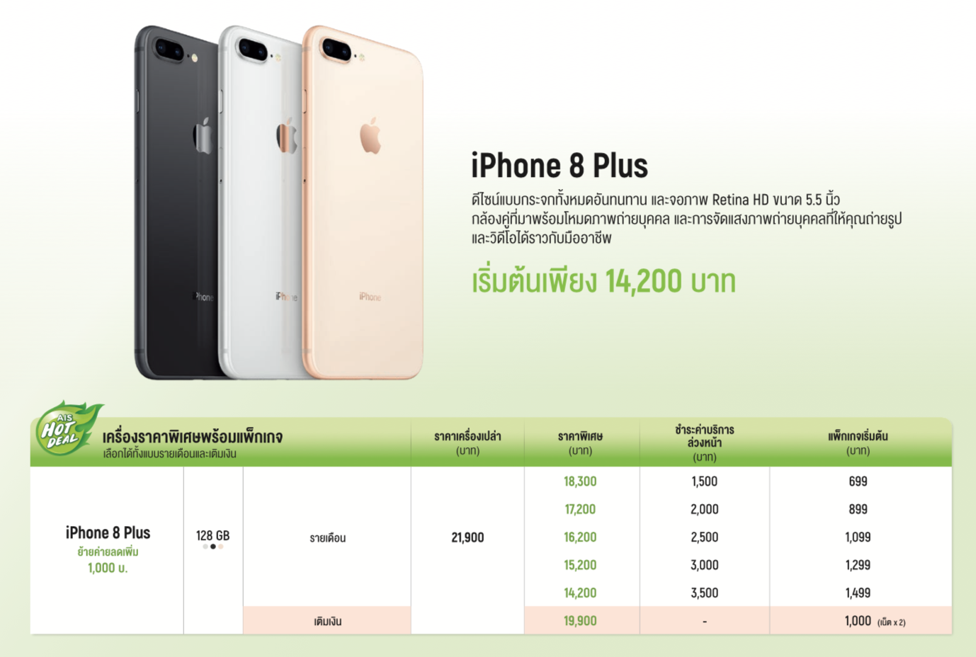 มาถึงโปรโมชั่นของ iPhone 8 Plus กันบ้าง ที่มาในโปรโมชั่นราคาเริ่มต้นเพียง 14,200 บาท สำหรับรุ่น 128 GB จากราคาปกติ 21,900 บาท เมื่อซื้อพร้อมสมัครแพ็กเกจ 1,499 และชำระค่าบริการล่วงหน้า 3,500 บาท