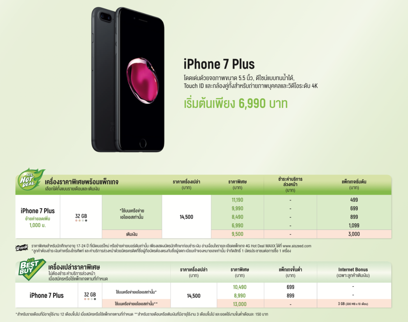 และสุดท้ายกับโปรโมชั่น iPhone 7 Plus ที่มาให้เป็นเจ้าของในราคาเริ่มต้นเพียง 6,990 บาท จากราคาปกติ 14,500 บาท สำหรับ iPhone 7 Plus รุ่น 32 GB เพียงซื้อเครื่องพร้อมแพ็กเกจ 1,099