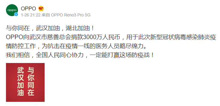 OPPO ได้ร่วมกันบริจาคเงินกว่า 30 ล้านหยวน หรือราวๆ 132 ล้านบาทให้กับสหพันธ์การกุศลอู่ฮั่น (Wuhan Charity Federation) เพื่อเป็นการสนับสนุนการป้องกันการแพร่ระบาดของเชื้อไวรัสโคโรนาสายพันธุ์ใหม่ 2019
