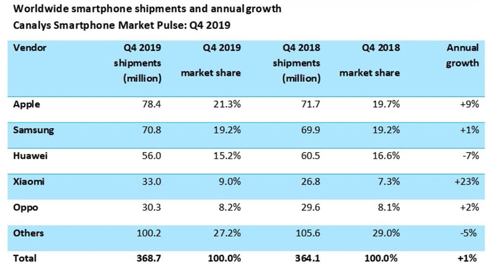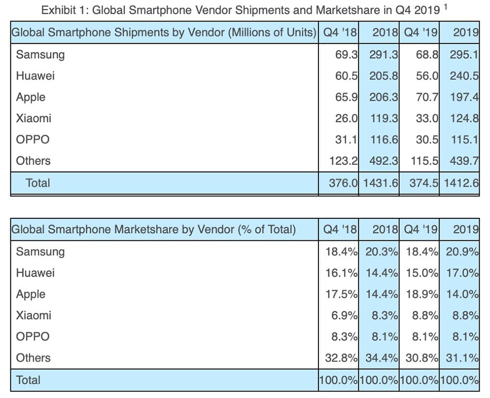 Samsung จัดส่งสมาร์ทโฟนได้ 68.8 ล้านเครื่อง ไตรมาสที่ 4 ของปี 2019 แต่ยังเป็นผู้ผลิตสมาร์ทโฟยรายใหญ่ที่สุด เมื่อนับรวมกับยอดจัดส่งตลอดทั้งปีที่ทำได้ 295.1 ล้านเครื่อง รองลงมาคือ Huawei มียอดจัดส่ง 56 ล้านเครื่อง ในไตรมาสสุดท้าย และมียอดจัดส่งตลอดทั้งปี 2019 อยู่ที่ 240.5 ล้านเครื่อง
