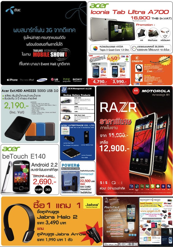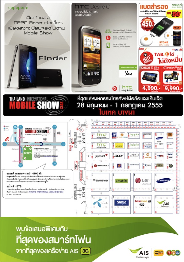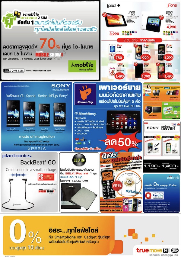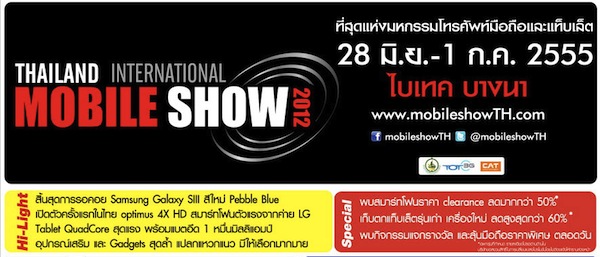 มาแล้วโปรโมชั่นมือถือในงาน Mobile Show 2012 วันที่ 28 มิ.ย.ถึง 1 ก.ค. 2555 นี้นอกจากจะมีโปรโมชั่นเด็ดๆโดนใจแล้ว ในงานยังมีการเปิดตัว LG Optimus 4X HD รุ่นล่าสุดจาก LG รวมถึง Tablet Quad Core สุดแรง พร้อมแบตอึก 1 หมื่นมิลลิแอมป์ และสิ้นสุดการรอคอยกับ Samsung Galaxy S III สีน้ำเงิน Pebble Blue ที่จะมีจำหน่ายในงาน