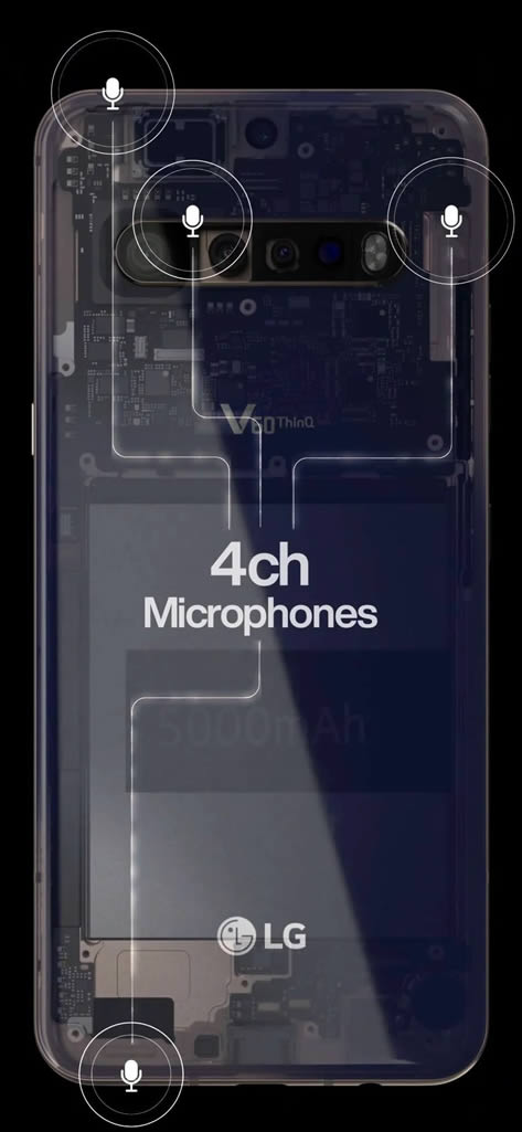 ภาพหลุดชุดนี้แสดงให้เห็นว่า LG V60 ThinQ ได้รับการติดตั้งกล้องหลัง 4 ตัว วางเรียงในแนวนอน พร้อมด้วยไมโครโฟนถึง 4 ตัว และยังมีช่องเสียบหูฟัง 3.5 มิลลิเมตร ที่ด้านล่าง
