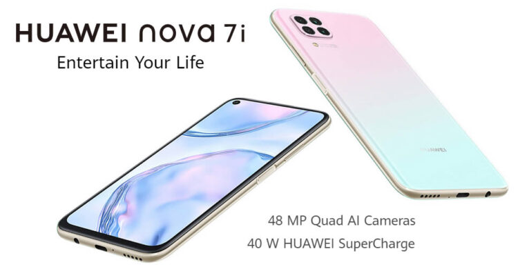 Huawei nova 7i เป็นอีกเวอร์ชั่นของ nova 6 SE ที่เคยเปิดตัวมาแล้วในประเทศจีน มาพร้อมจอแสดงผล LCD Full HD + (2310 x 1080 พิกเซล) ขนาด 6.4 นิ้ว ทำงานบนพื้นฐาน Android 10 สวมทับด้วย EMUI 10.0.1 ใช้ชิปประมวลผล Kirin 810 Octa-Core (2x Cortex-A76 2.27GHz + 6x Cortex-A55 1.88GHz) ความจำ RAM 8GB จับคู่กับ ROM 128GB รองรับนาโนการ์ด สูงสุด 256GB ความจุแบตเตอรี่ 4,200mAh รองรับชาร์จเร็ว 40 วัตต์ ใช้เวลาชาร์จแบตเตอรี่จาก 0 – 70% ในเวลาเพียง 30 นาที