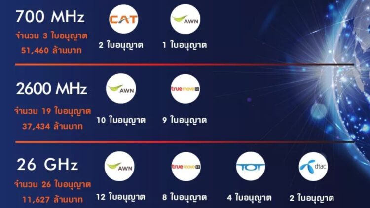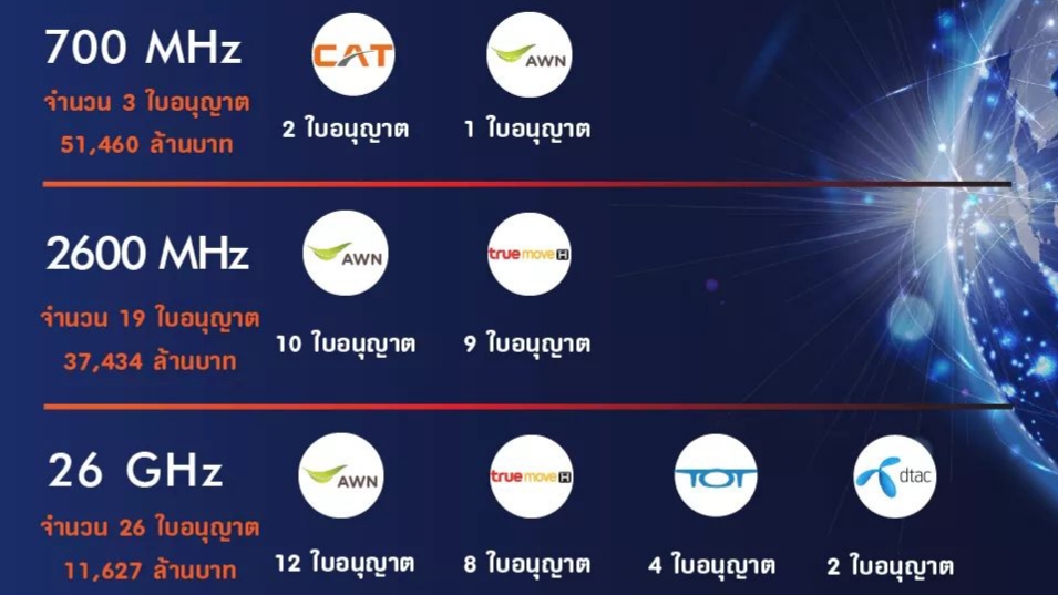 แบ่งเป็น คลื่นความถี่ 700 MHz เงินประมูลรวม 51,460 ล้านบาท คลื่นความถี่ 2600 MHz เงินประมูลรวม 37,434 ล้านบาท และคลื่นความถี่ 26 GHz เงินประมูลรวม 11,627 ล้านบาท
