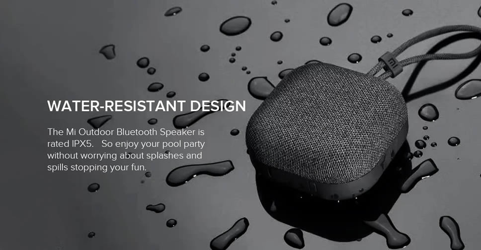 Xiaomi Mi Outdoor Bluetooth Speaker มีการบุผ้าด้านอกคล้ายกับที่พบใน Amazon Echo หรือ Google Home Mini แต่ได้รับการออกแบบมาให้ใช้งานนอกบ้าน จึงป้องกันน้ำได้ในระดับ IPX5
