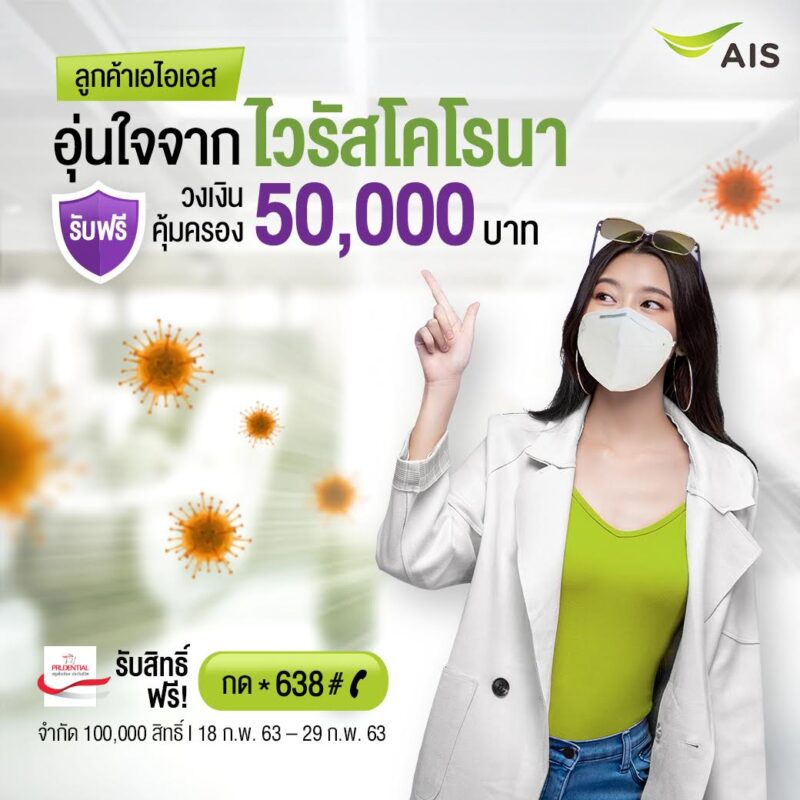 AIS มอบประกันชีวิตไวรัสโคโรนา หรือ โควิด-19 ฟรี! ครั้งแรกของไทย วงเงิน 50,000 บาท กด *638# โทรออก