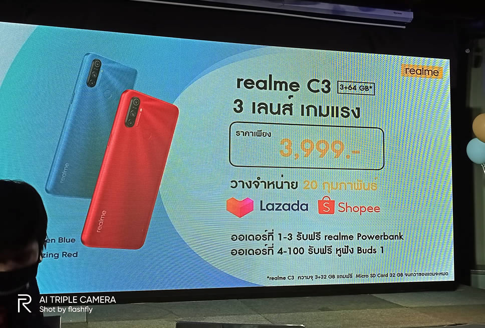 realme C3 จะเริ่มวางจำหน่ายในวันที่ 20 กุมภาพันธ์นี้ ผ่านร้านค้าออนไลน์ Lazada และ Shopee ราคา 3,999 บาท พิเศษ!! สำหรับผู้ที่จับจองเป็นเจ้าของ 1 – 3 รายแรก รับฟรี realme Powerbank และผู้ที่ทำรายการสั่งซื้อเป็นรายที่ 4 – 100 รับฟรี หูฟัง realme Buds 1