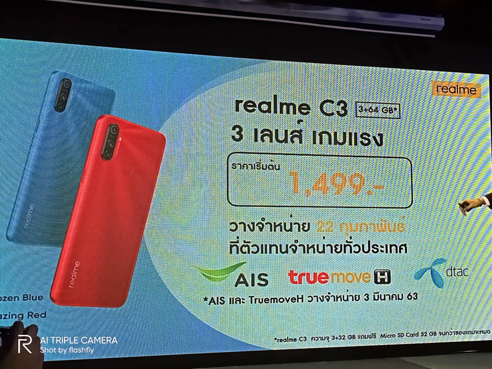 สำหรับผู้ที่สั่งซื้อ realme C3 กับผู้ให้บริการฯ AIS, TrueMove H และ Dtac มีสิทธิ์เป็นเจ้าของในราคาเริ่มต้นเพียง 1,499 บาท