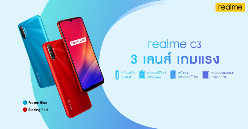 realme เปิดตัวสมาร์ทโฟน C3 ในประเทศไทยอย่างทางการแล้ว โดยชูจุดเด่นที่กล้องหลัง 3 เลนส์ แบตเตอรี่ขนาดใหญ่ 5000mAh จอแสดงผลแบบหยดน้ำ 6.5 นิ้ว และเป็นสมาร์ทโฟนรุ่นแรกในไทย ที่ใช้ชิปประมวลผล Helio G70