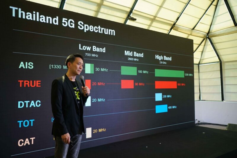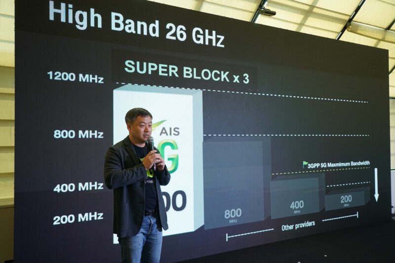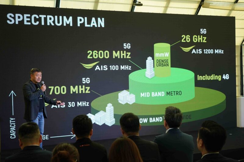 นายปรัธนา ลีลพนัง หัวหน้าคณะผู้บริหารกลุ่มลูกค้าทั่วไป เอไอเอส เปิดเผยว่า “จากวิสัยทัศน์ของเราที่มุ่งมั่นนำเทคโนโลยีดิจิทัลมายกระดับโครงสร้างพื้นฐานของประเทศ เอไอเอสจึงตั้งใจอย่างยิ่งในการเข้าประมูลคลื่น 5G แบบเต็ม Block ในทุกย่านความถี่ โดยมีครบทั้งย่านความถี่ต่ำ ย่านความถี่กลาง และย่านความถี่สูง ครอบคลุมการใช้งานทุกรูปแบบ ประกอบด้วย คลื่น 700 MHz จำนวน 30 MHz (2×15 MHz), คลื่น 2600 MHz จำนวน 100 MHz และคลื่น 26 GHz จำนวน 1200 MHz รวมคลื่นความถี่ 5G ทั้งหมดอยู่ที่ 1330 MHz และเมื่อรวมกับคลื่นความถี่เดิมที่ AIS มีจำนวนมากที่สุดอยู่แล้ว