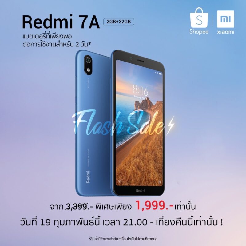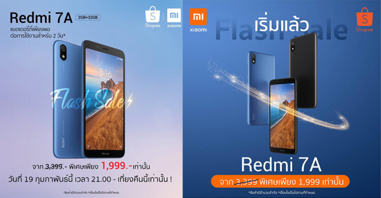 เสียวหมี่ ประเทศไทย ร่วมกับ Shopee สร้างปรากฎการณ์จัดโปรโมชั่น Flash Sale มอบความพิเศษให้ลูกค้าได้เป็นเจ้าของสมาร์ทโฟนรุ่นฮิตในตระกูล Redmi อย่าง Redmi 7A รุ่น RAM 2GB+32GB ในราคาเพียง 1,999 บาท จากราคาปกติ 3,399 บาท ซึ่งโปรโมชั่นนี้มีเพียงวันเดียวเท่านั้น เริ่มตั้งแต่ 00.01 – 12.00 น. ของวันที่ 19 กุมภาพันธ์ 2563