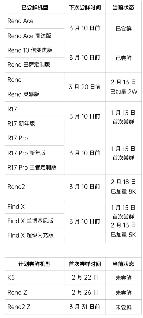นอกจากนี้ OPPO K5 กับ Reno Z จะได้รับการอัพเดท ColorOS 7 ในวันที่ 22 และ 26 กุมภาพันธ์นี้ ตามลำดับ และ Reno2 Z จะได้รับการอัพเดทในวันที่ 31 มีนาคม 2020