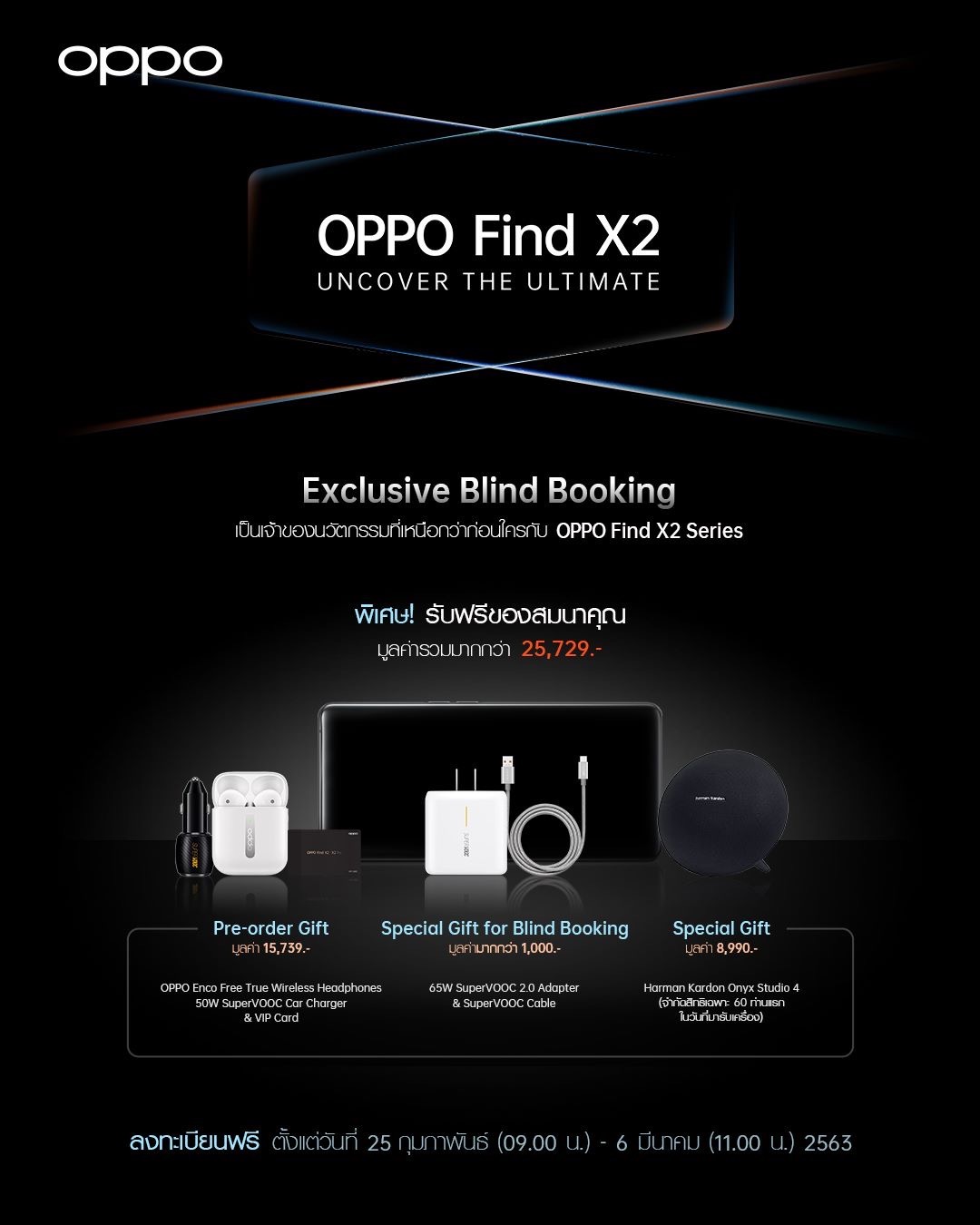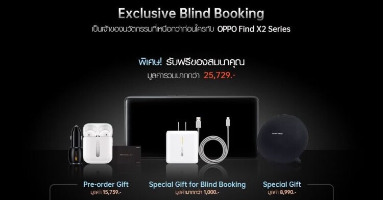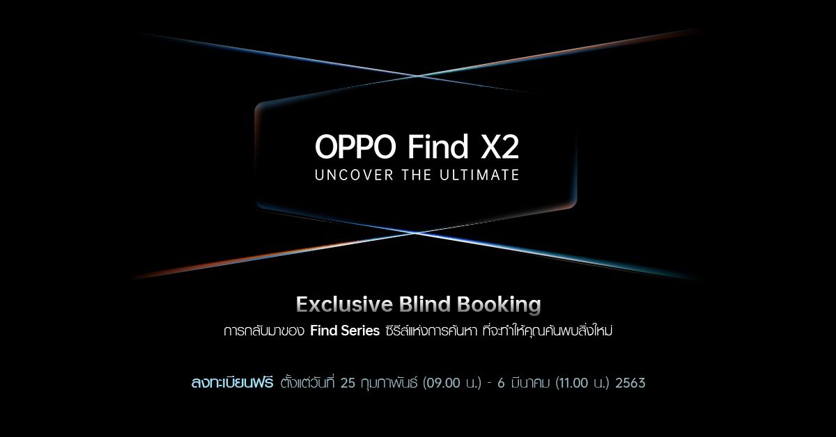 OPPO Find X2 Series เริ่มเปิดจองล่วงหน้า ตั้งแต่วันที่ 25 กุมภาพันธ์ (9.00 น.) – 6 มีนาคม (11.00 น.) 2563 โดยสามารถทำการลงทะเบียนฟรีได้ที่ https://oppofindx2blindbooking.oppo.in.th/