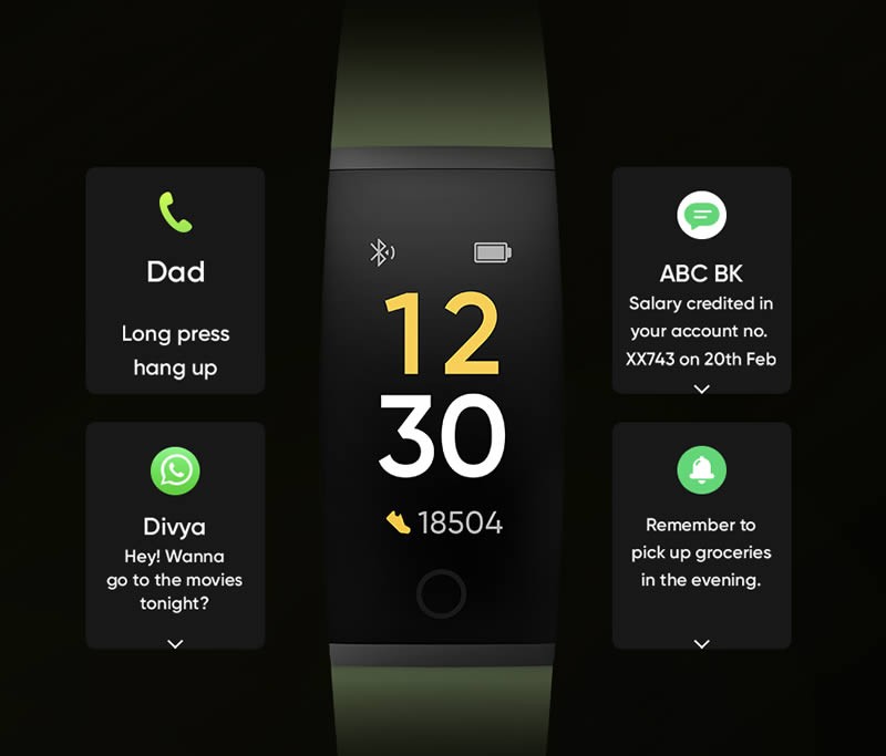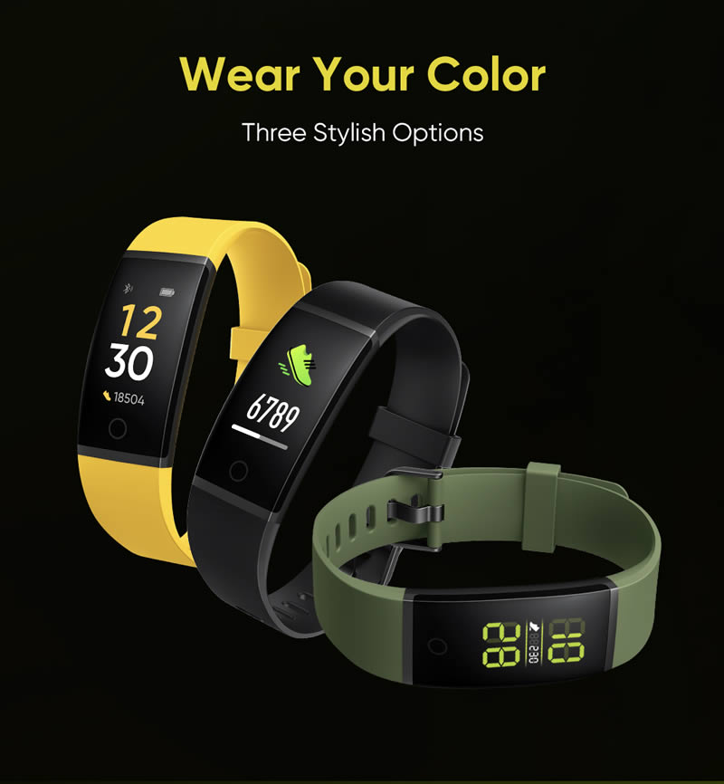 realme Band มาพร้อมจอสีขนาดใหญ่ รองรับการแจ้งเตือนจากสมาร์ทโฟน ผลิตออกมาให้เลือก อย่างน้อย 3 สี ได้แก่ สีเขียว สีดำ และ สีเหลือง สามารถป้องกันน้ำในระดับ IP68