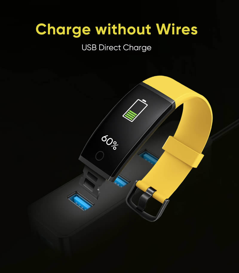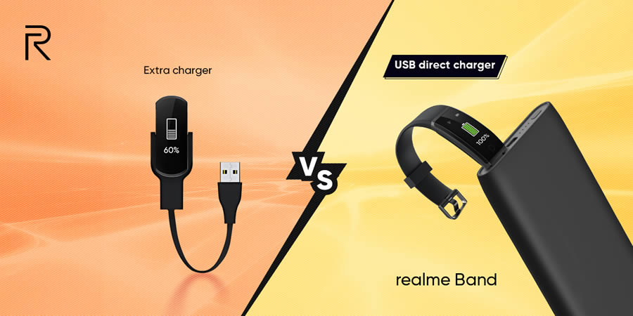 realme Band มีดีไซน์แตกต่างจาก Smartband รุ่นอื่นที่สามารถถอดสายรัดออกข้างหนึ่ง เพื่อชาร์จแบตเตอรี่ได้โดยตรง โดยเสียบเข้าไปกับพอร์ต USB-A ของ Power Bank หรือแล็ปท็อป รวมถึงแหล่งจ่ายไฟอื่นๆ ที่รองรับพอร์ต USB-A