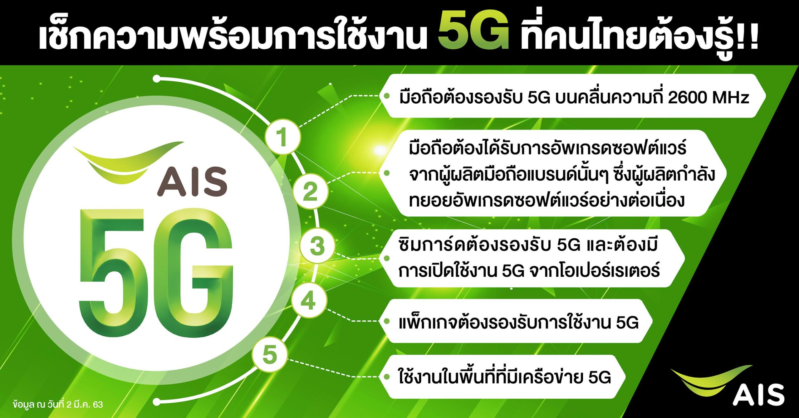 หลังจากที่ AIS ได้เข้าชำระเงินค่าคลื่น 2600 MHz งวดแรก เรียบร้อยแล้วเมื่อวันที่ 21 กุมภาพันธ์ 2563 ที่ผ่านมา และได้รับใบอนุญาตให้ใช้คลื่นความถี่ 2600 MHz เพื่อให้บริการ 5G อย่างเป็นทางการ เป็นรายแรกและรายเดียวในอุตสาหกรรม จึงทำให้ AIS สามารถเปิดให้บริการ 5G เชิงพาณิชย์ให้กับคนไทยได้อย่างเป็นทางการแล้วและเป็นประเทศแรกที่ให้บริการ 5G บนมือถือในเอเชียตะวันออกเฉียงใต้ได้สำเร็จอีกด้วย