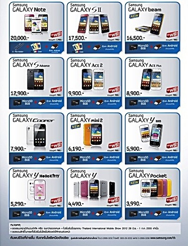 - Samsung Galaxy Beam – 16,500 บาท รับฟรีของแถมมูลค่า 980 บาท MicroSD 8GB + ตุ๊กตา Android (จำนวนจำกัด)